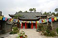 万佛阁,山门向南,二门向西,万佛阁位居寺内东隅,面宽三间,二层三滴水,歇山式屋项,上下两层塑佛像万尊,故名。阁身前檐两层皆施廊柱,设勾栏赁依,外观壮丽雅致。阁上悬有明代大铜钟一口,重约3500公斤。寺内西南隅,有藏式佛塔两座,高约4米,青石雕成,形制秀美,为寺中小品。